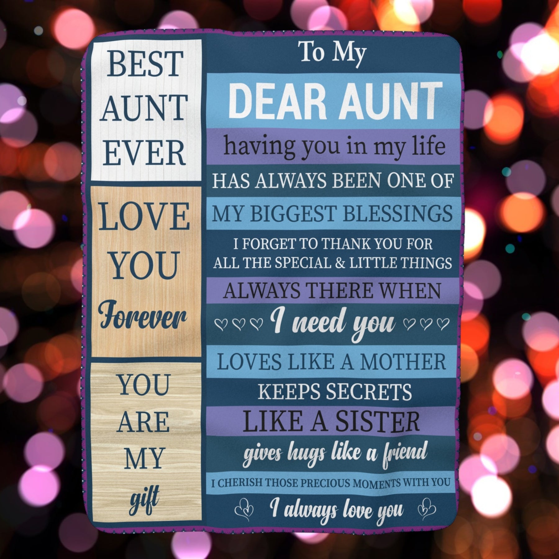This Sherpa Fleece Blanket is the perfect way to show love to your Aunt. With hemmed edges for durability, a soft sherpa fleece backside for extra coziness, and made with 100% polyester for warmth and softness, this blanket is a thoughtful gift for any occasion. Whether as a birthday present, holiday gift, or just to show appreciation, this blanket is sure to bring comfort and joy to your Aunt's life.