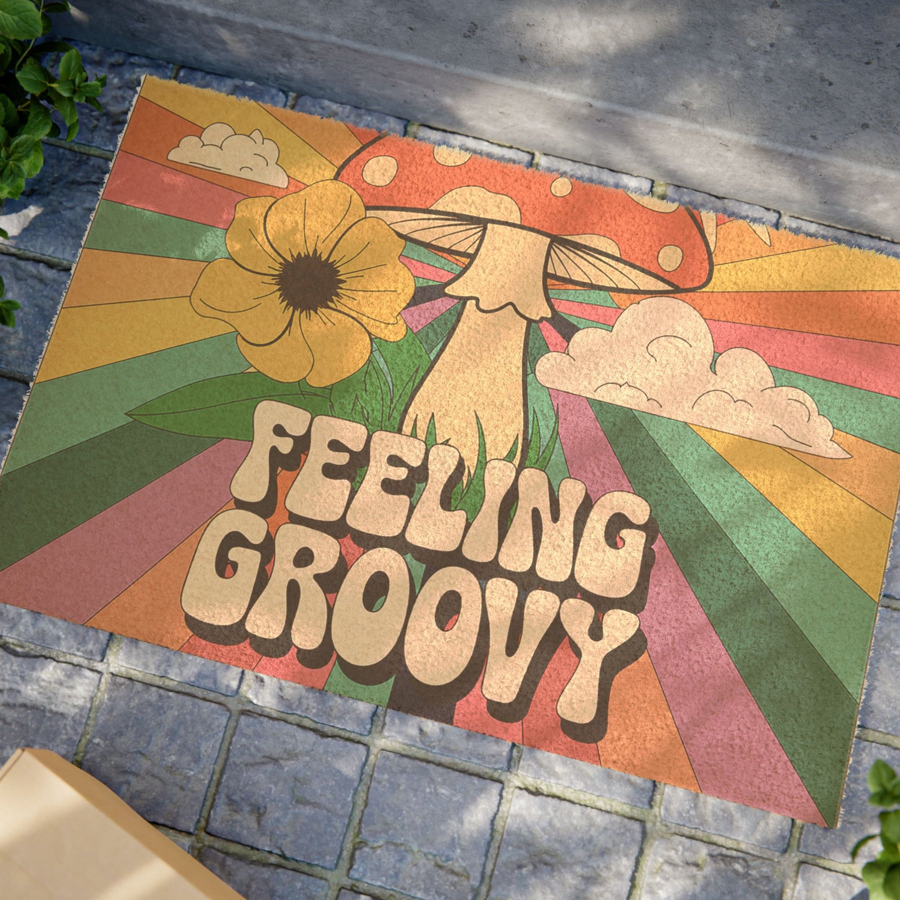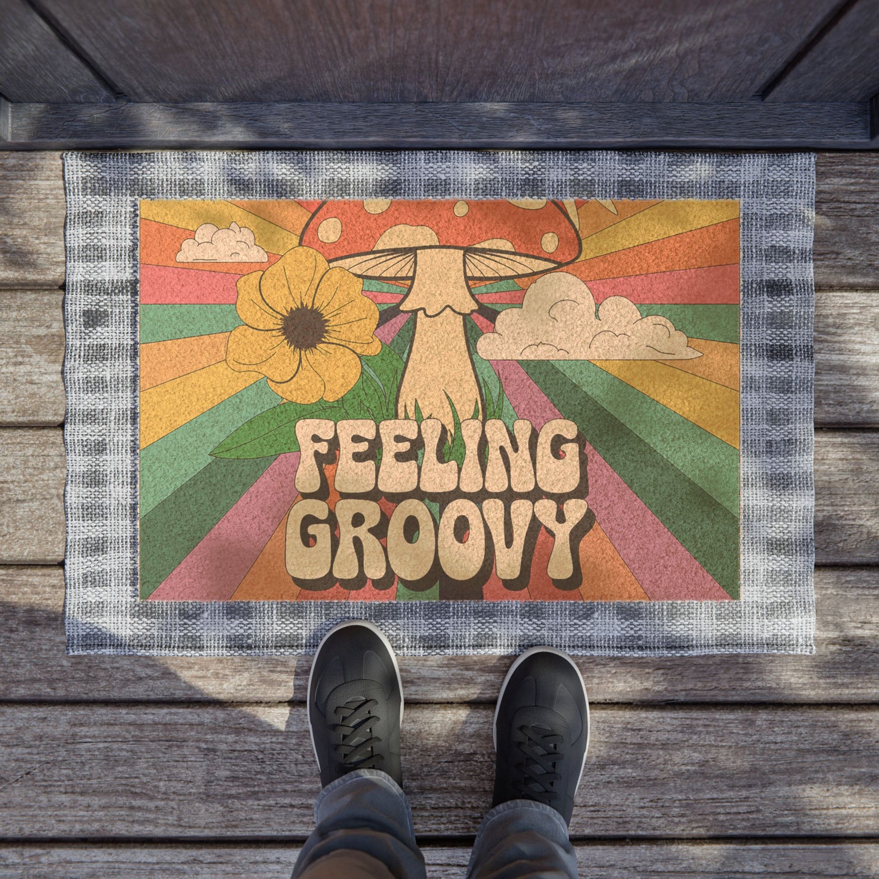 A groovy doormat that adds a retro vibe to your entryway. Perfect for those who love a nostalgic, fun atmosphere. Great for anyone looking to make a statement at their front door during the summer season or for hosting 70s-themed parties.