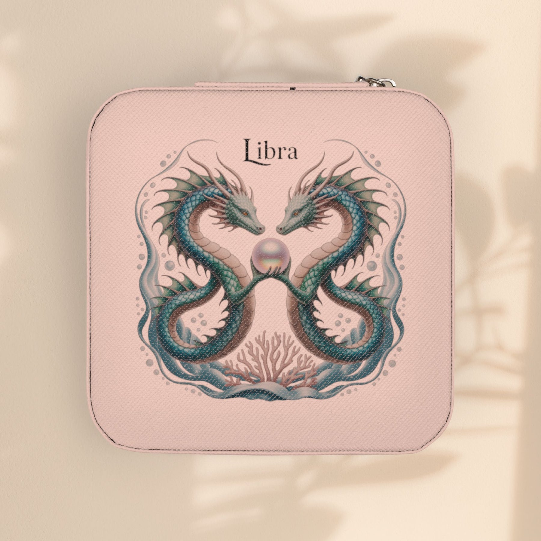 This compact jewelry travel case brings a little moment of calm to the chaos of packing. Soft pink PU leather wraps a plush, scratch-resistant interior where rings, chains, and tiny keepsakes rest safely. Four divided compartments, cushioned ring rolls, and necklace hooks keep each piece visible and tangle-free, while the square zip-around design locks everything in place. Sized to slide into a purse or carry-on, it’s meant for people who travel light but care deeply for the details — those who want their favorite pieces ready to wear without the rummage. The subtle Libra-inspired motif adds a gentle, personal touch, finished with a UV-decorated surface that stays crisp through journeys.