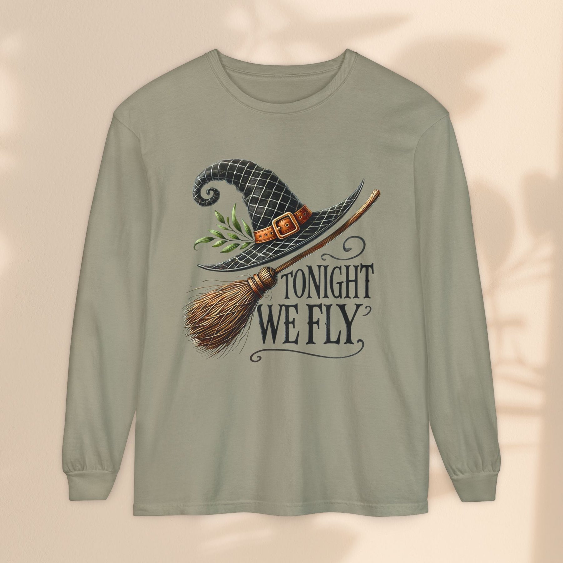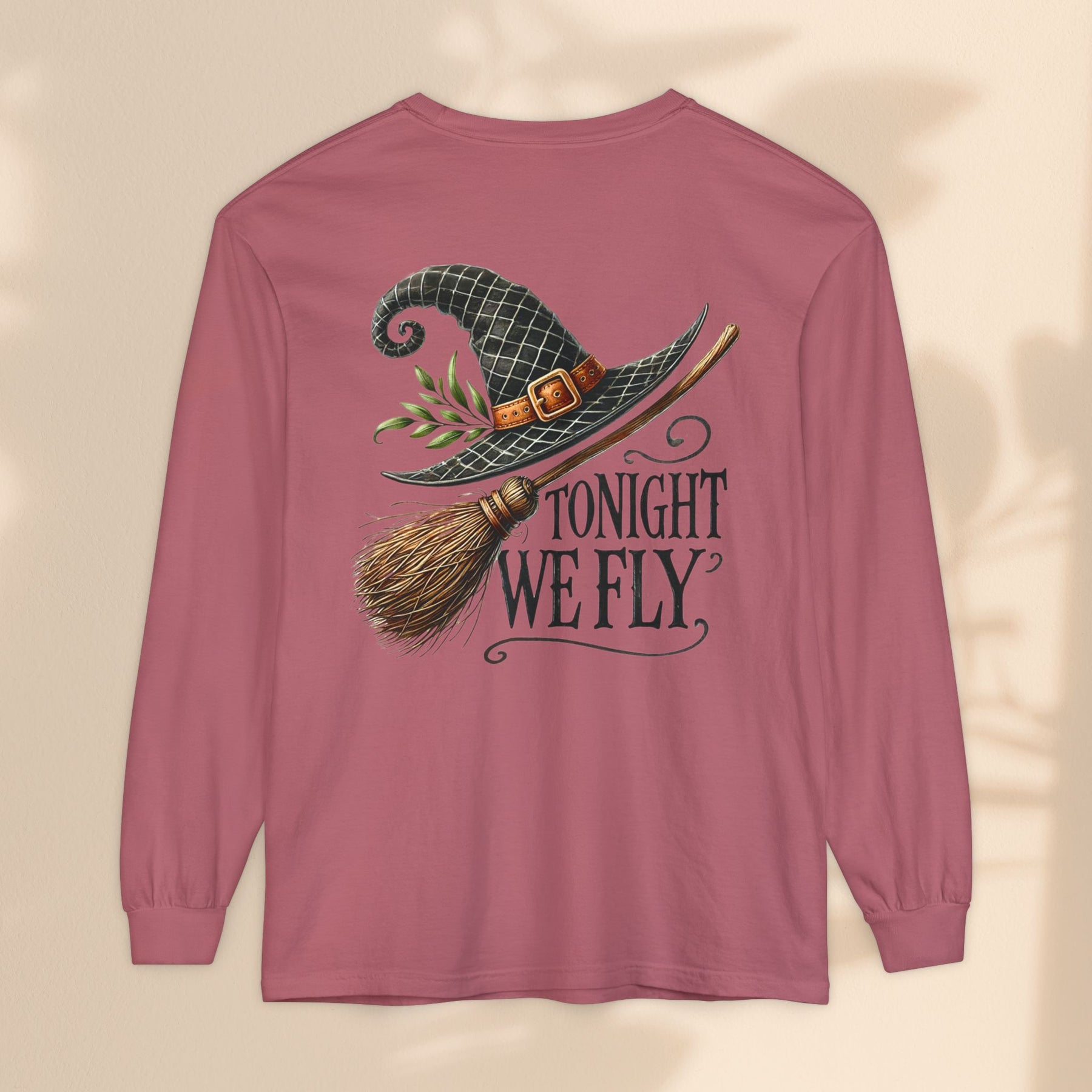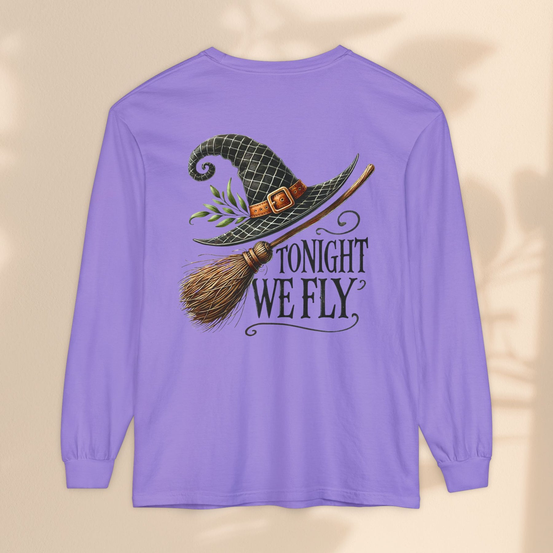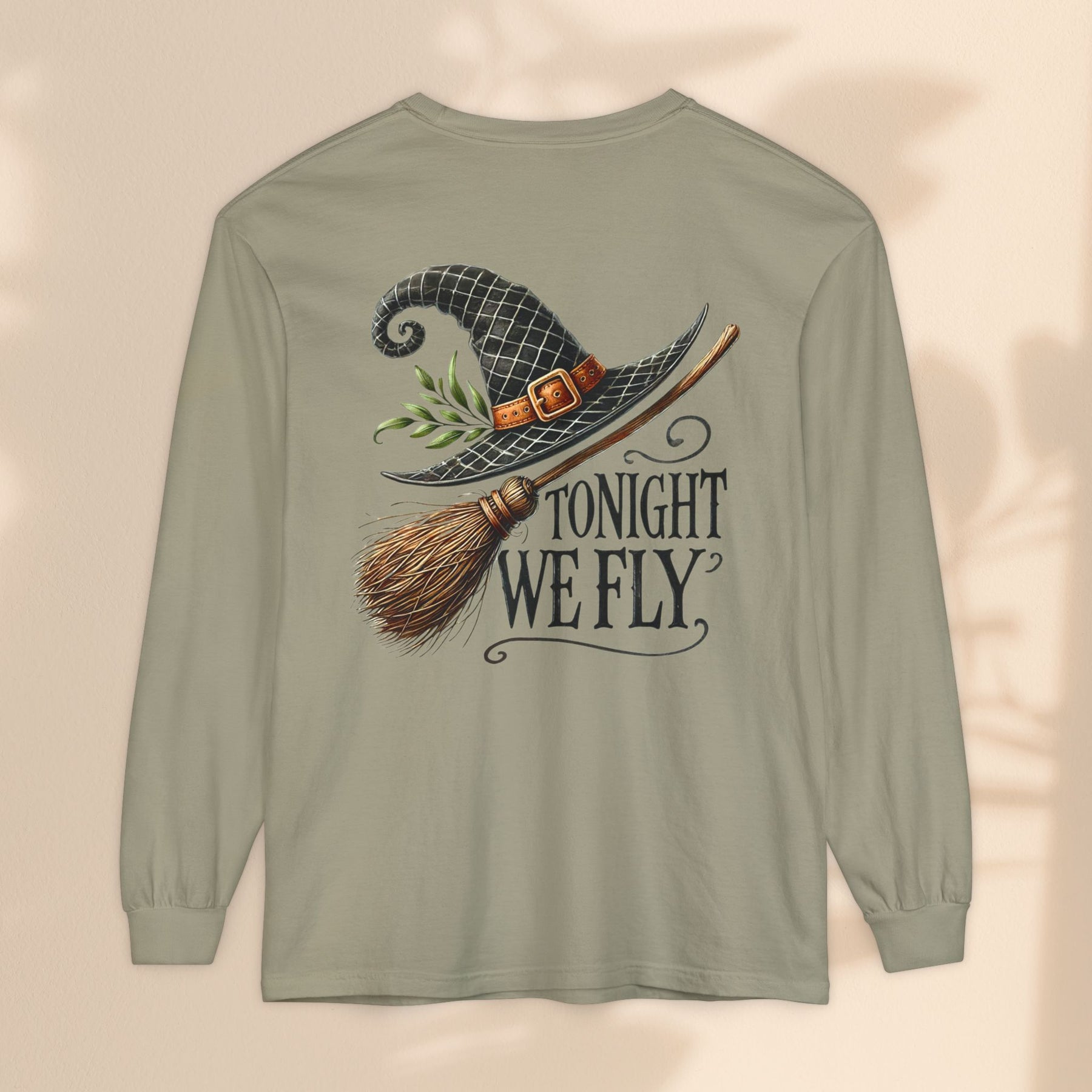 A whimsical witch-themed long sleeve t-shirt perfect for Halloween with the design 'Tonight We Fly'. This garment-dyed, 100% ring spun cotton shirt gives off a magical and playful vibe, ideal for those who love Halloween and witchy aesthetics. Can be worn for Halloween parties, trick-or-treating, or casual wear during the spooky season.