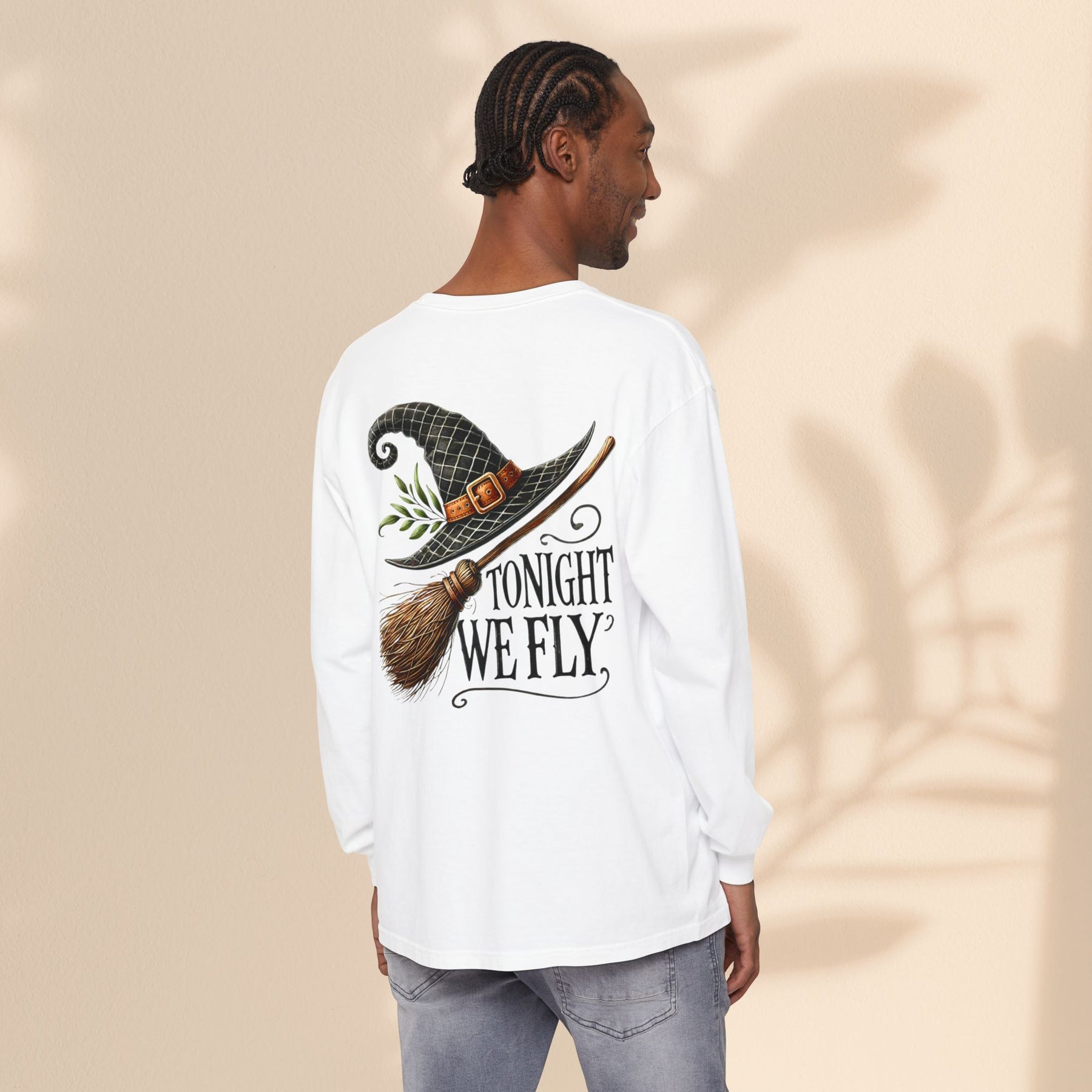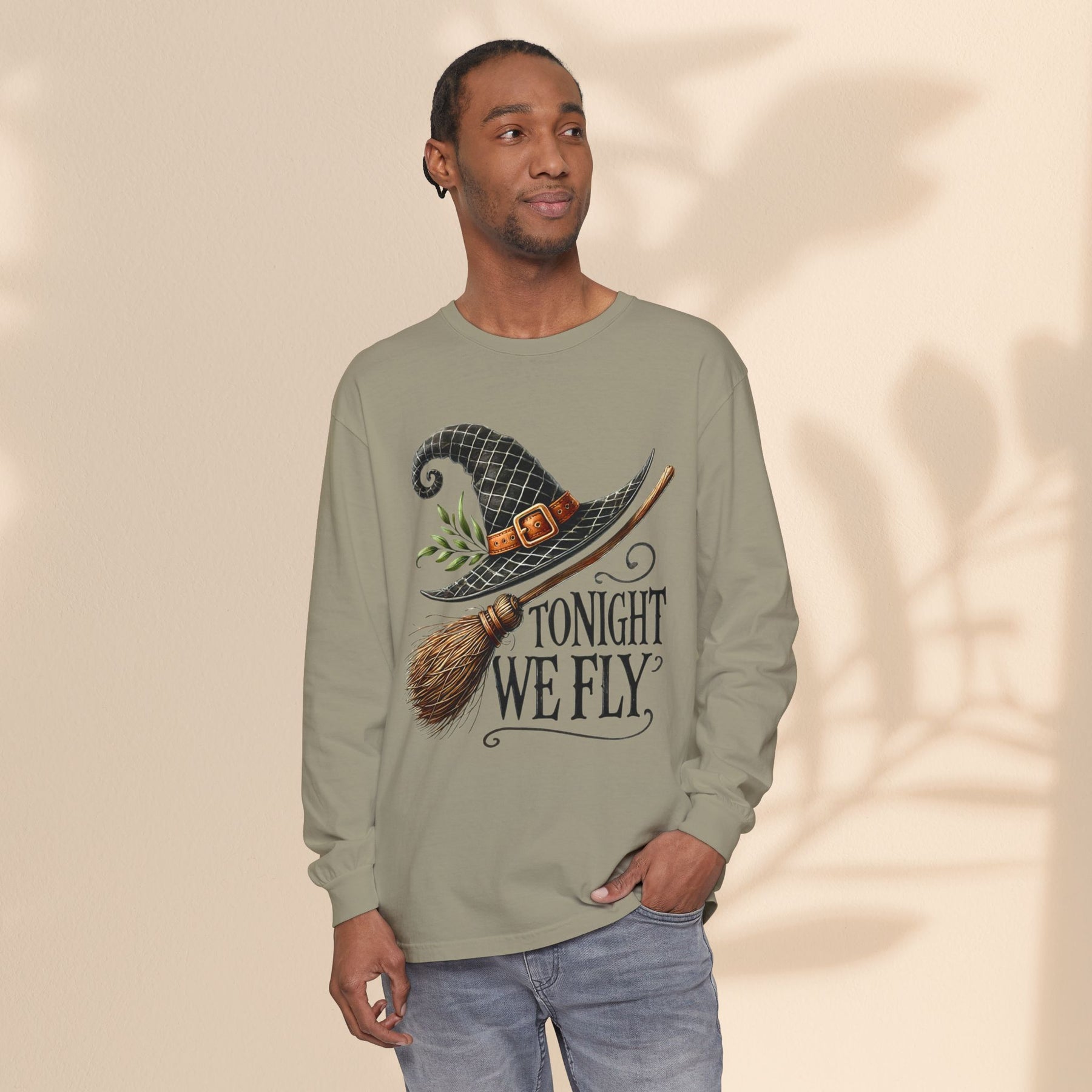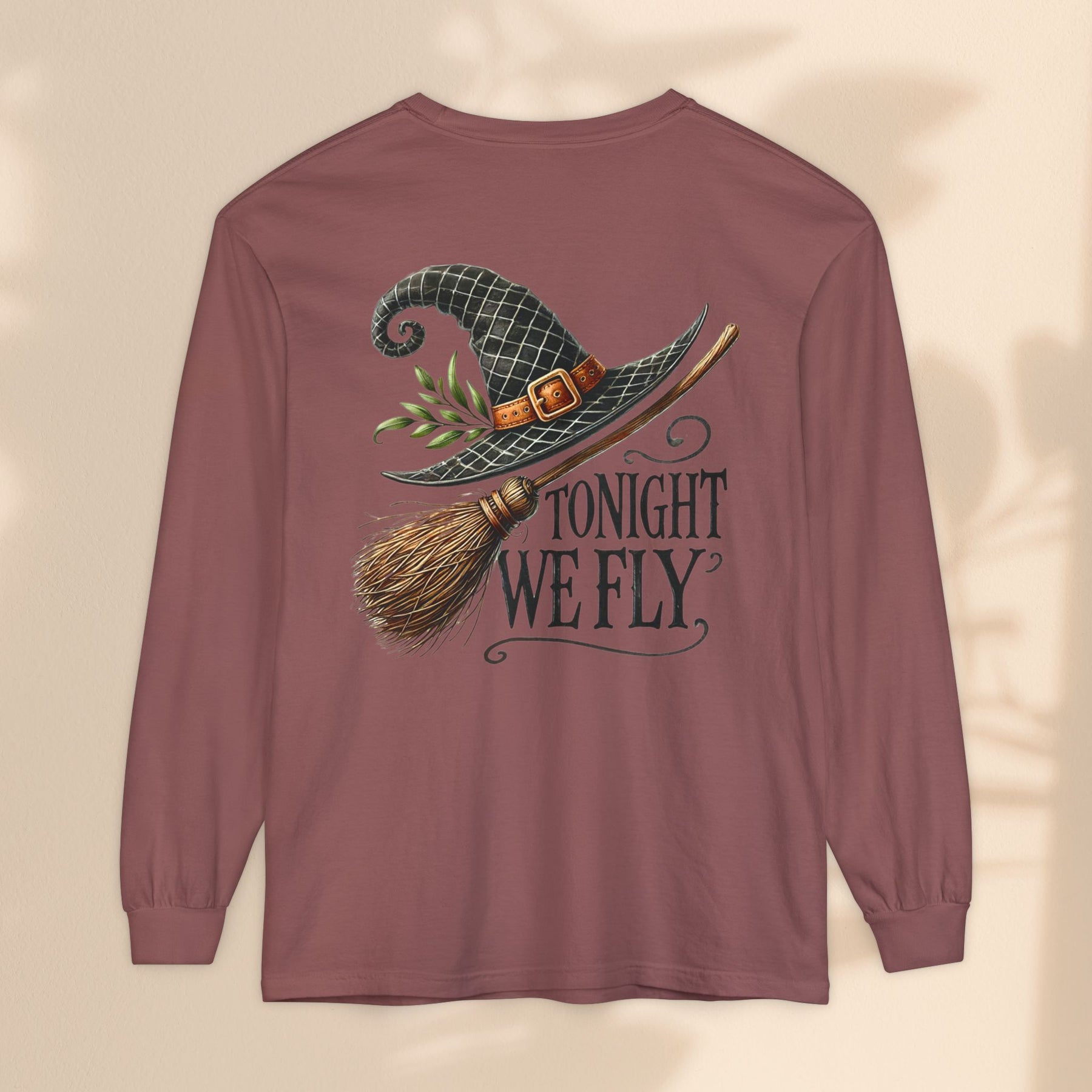 A whimsical witch-themed long sleeve t-shirt perfect for Halloween with the design 'Tonight We Fly'. This garment-dyed, 100% ring spun cotton shirt gives off a magical and playful vibe, ideal for those who love Halloween and witchy aesthetics. Can be worn for Halloween parties, trick-or-treating, or casual wear during the spooky season.