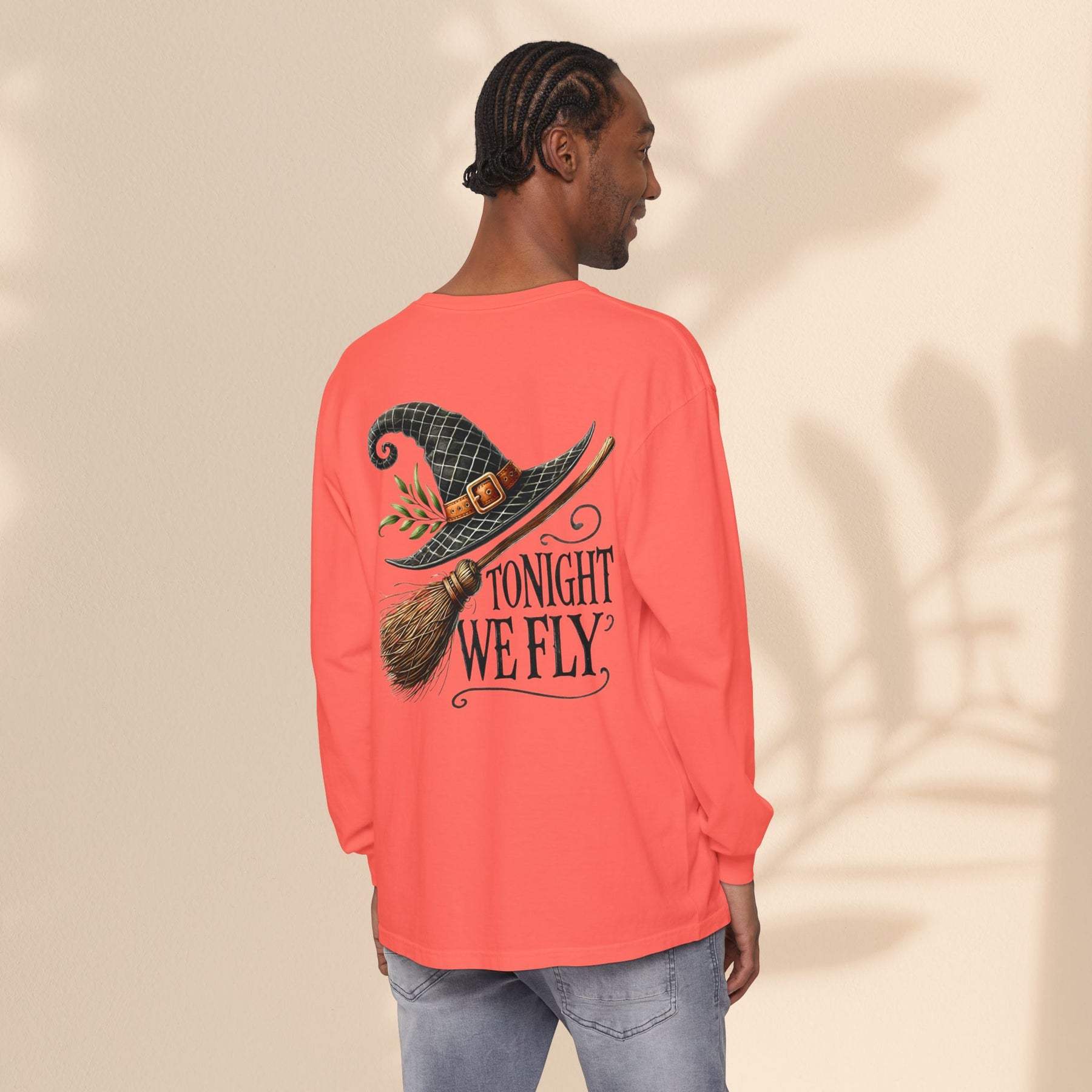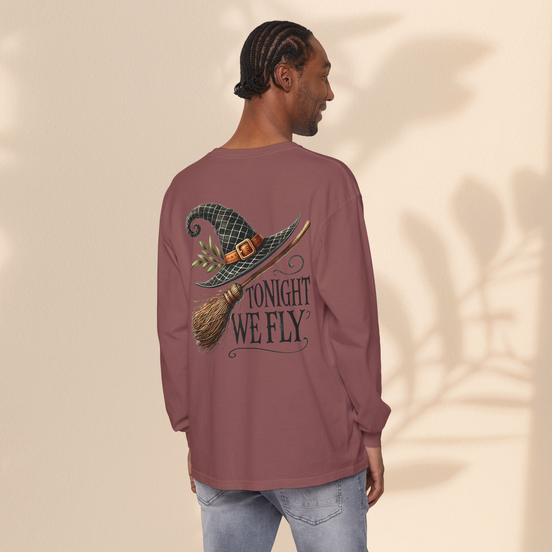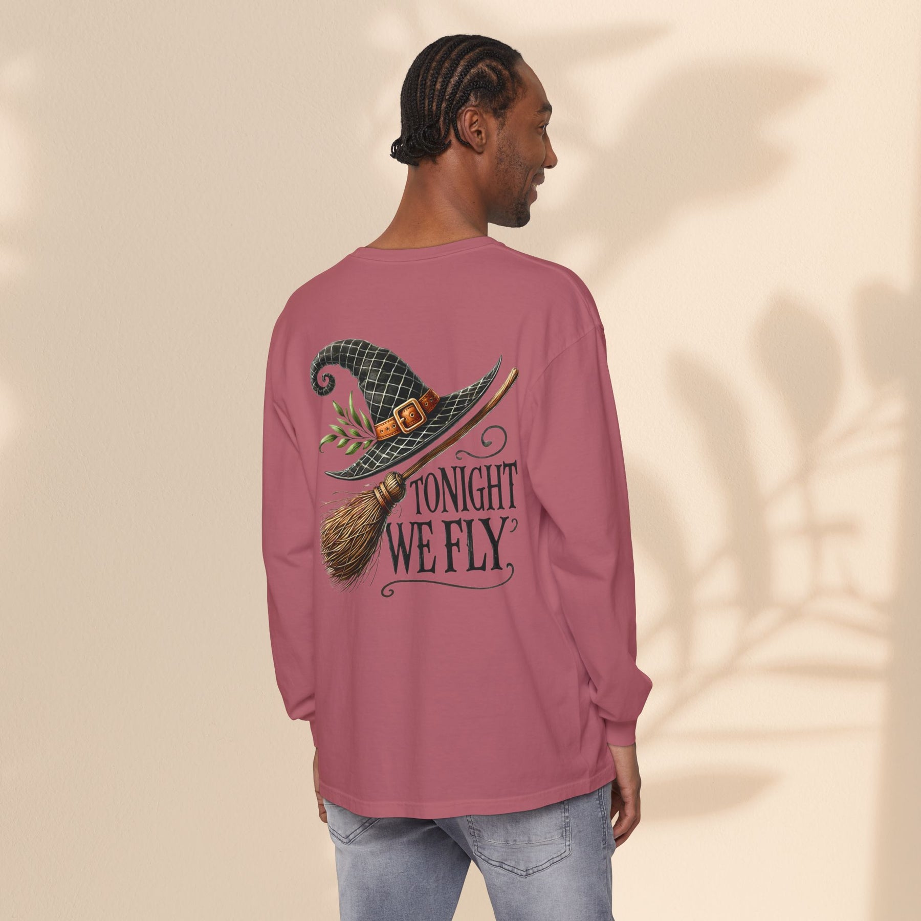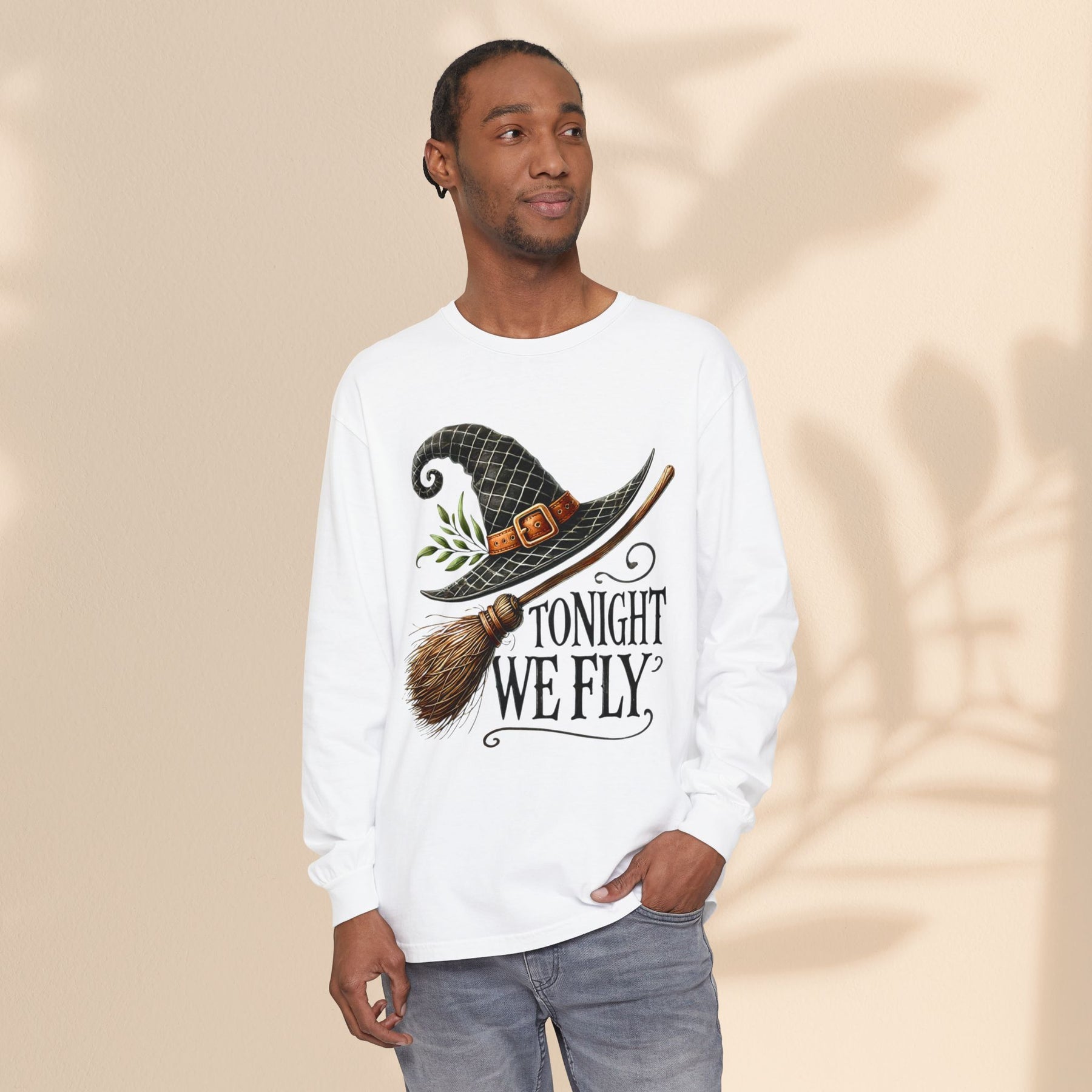 A whimsical witch-themed long sleeve t-shirt perfect for Halloween with the design 'Tonight We Fly'. This garment-dyed, 100% ring spun cotton shirt gives off a magical and playful vibe, ideal for those who love Halloween and witchy aesthetics. Can be worn for Halloween parties, trick-or-treating, or casual wear during the spooky season.