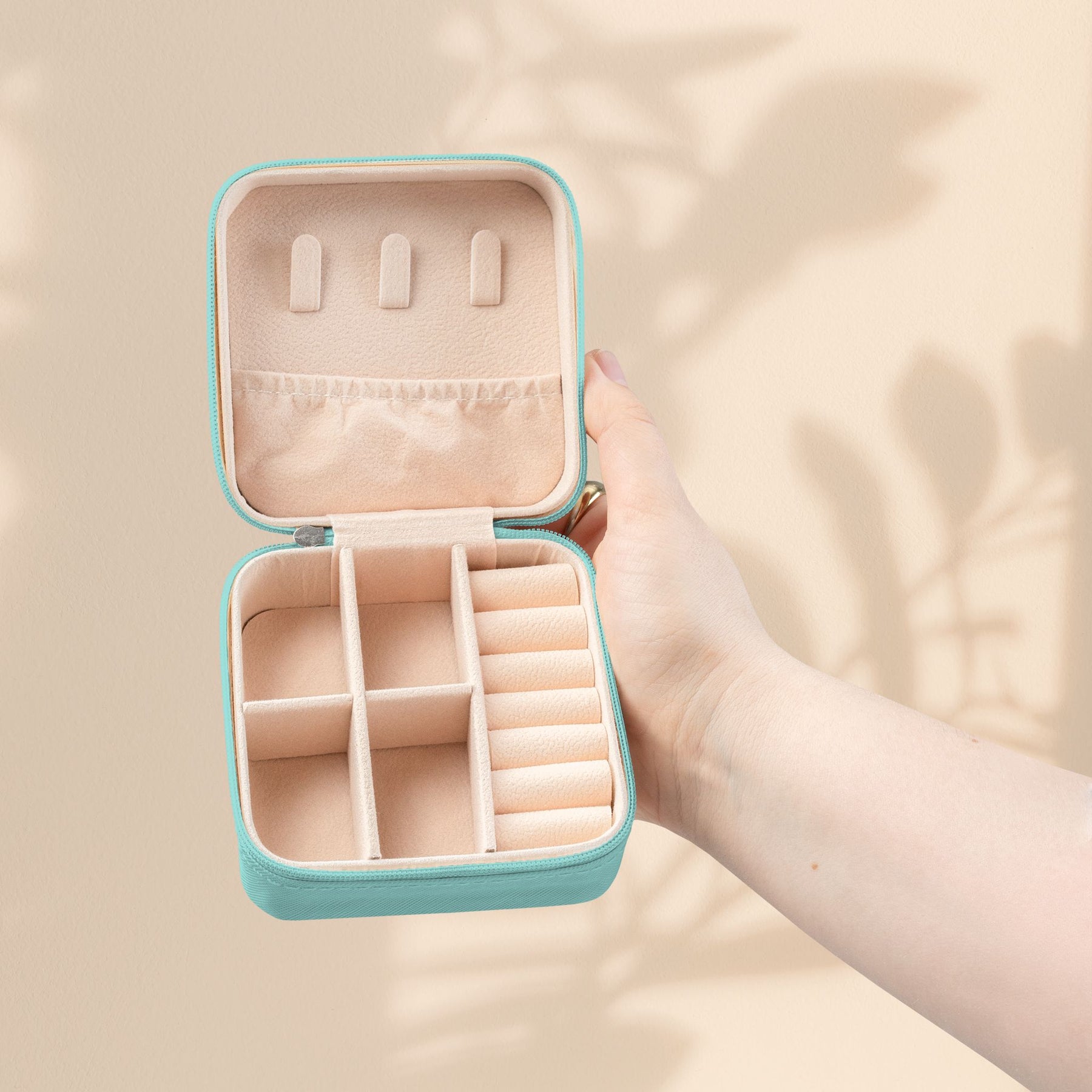 - Interior organization: 4 compartments, ring rolls, and necklace hooks