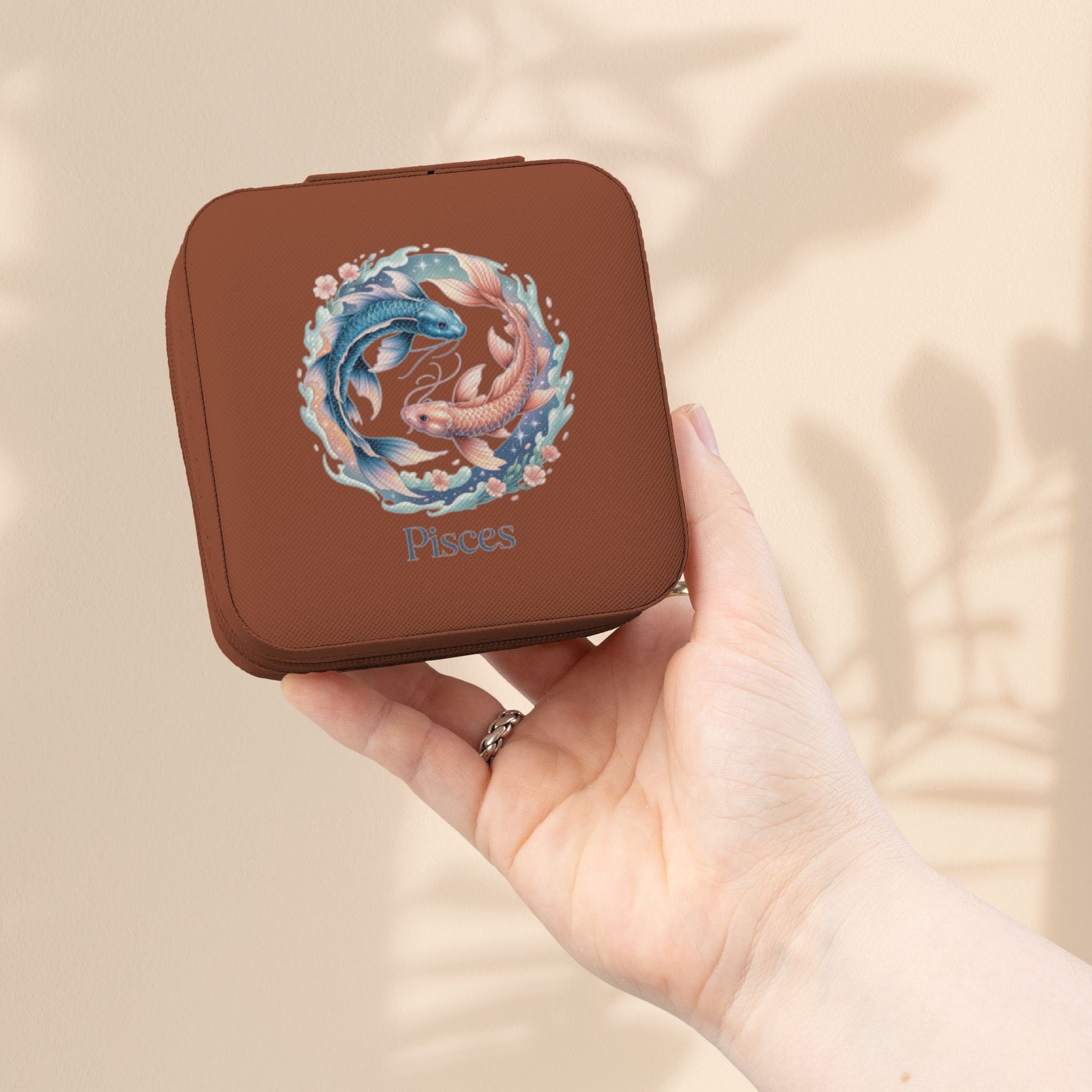 A petite, blush travel case designed for the Pisces soul who carries meaning in every tiny treasure. Soft PU leather wraps a plush, scratch-resistant interior that cradles rings, studs and delicate chains. Inside, four divided compartments, snug ring rolls and small necklace hooks keep each piece separate and tangle-free during a weekend trip or nightly stay. The square zip-around closure shuts with confidence so nothing slips out, and the UV-decorated Pisces motif adds a personal, celestial touch. Lightweight and compact at 4" x 4" x 2", this organizer slides into a toiletry bag or purse and makes packing jewelry feel thoughtful and simple.
