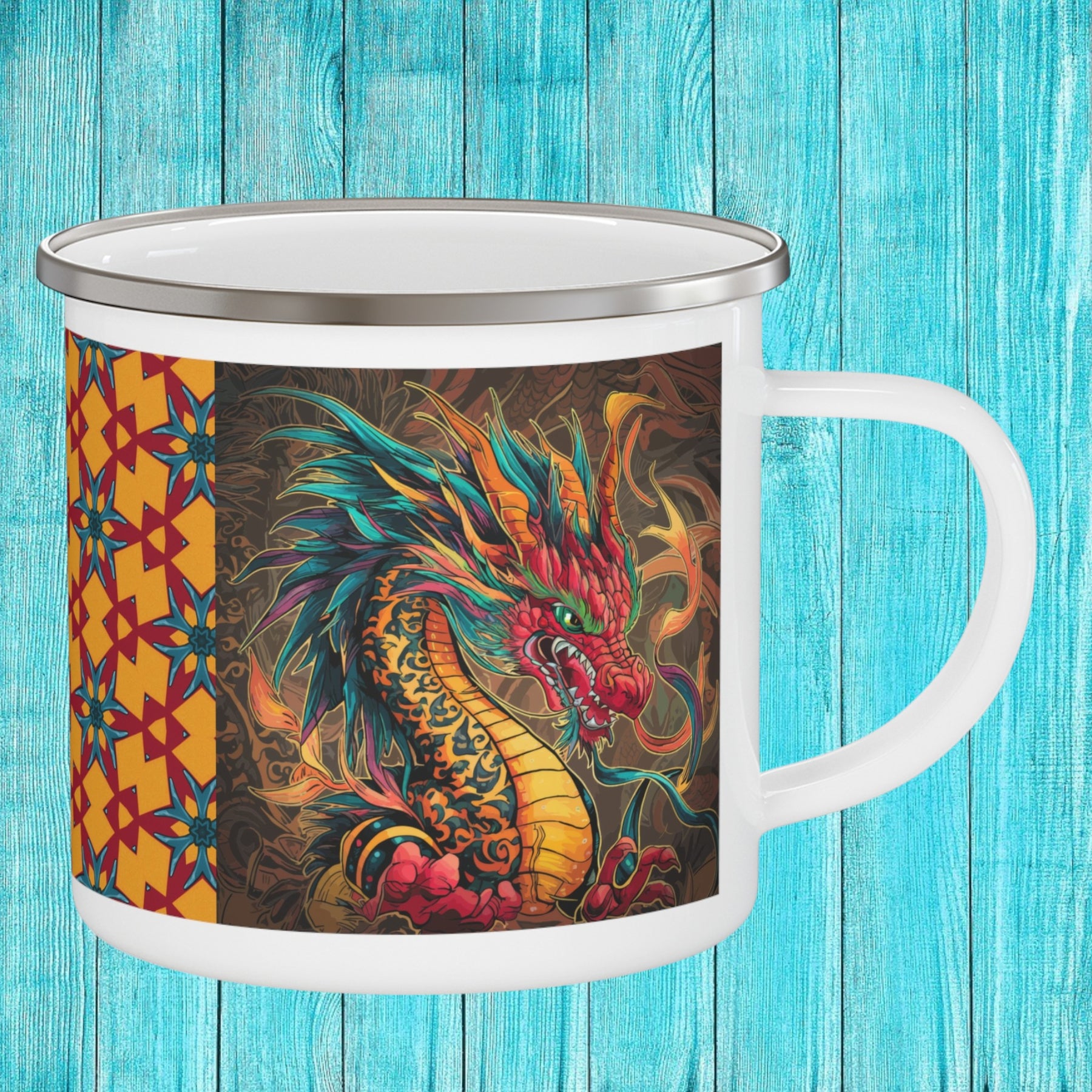 Introducing the "Fire Dragon" enamel mug, a durable and stylish choice for holding 12 ounces of your favorite beverage. This robust mug is perfect for both indoor and outdoor activities and can withstand the dirt and grunge of campsites. The captivating fire dragon design, printed in full color, adds a personalized touch to your hipster moments, whether you're sipping coffee or tea or enjoying your morning cereal in the wild.