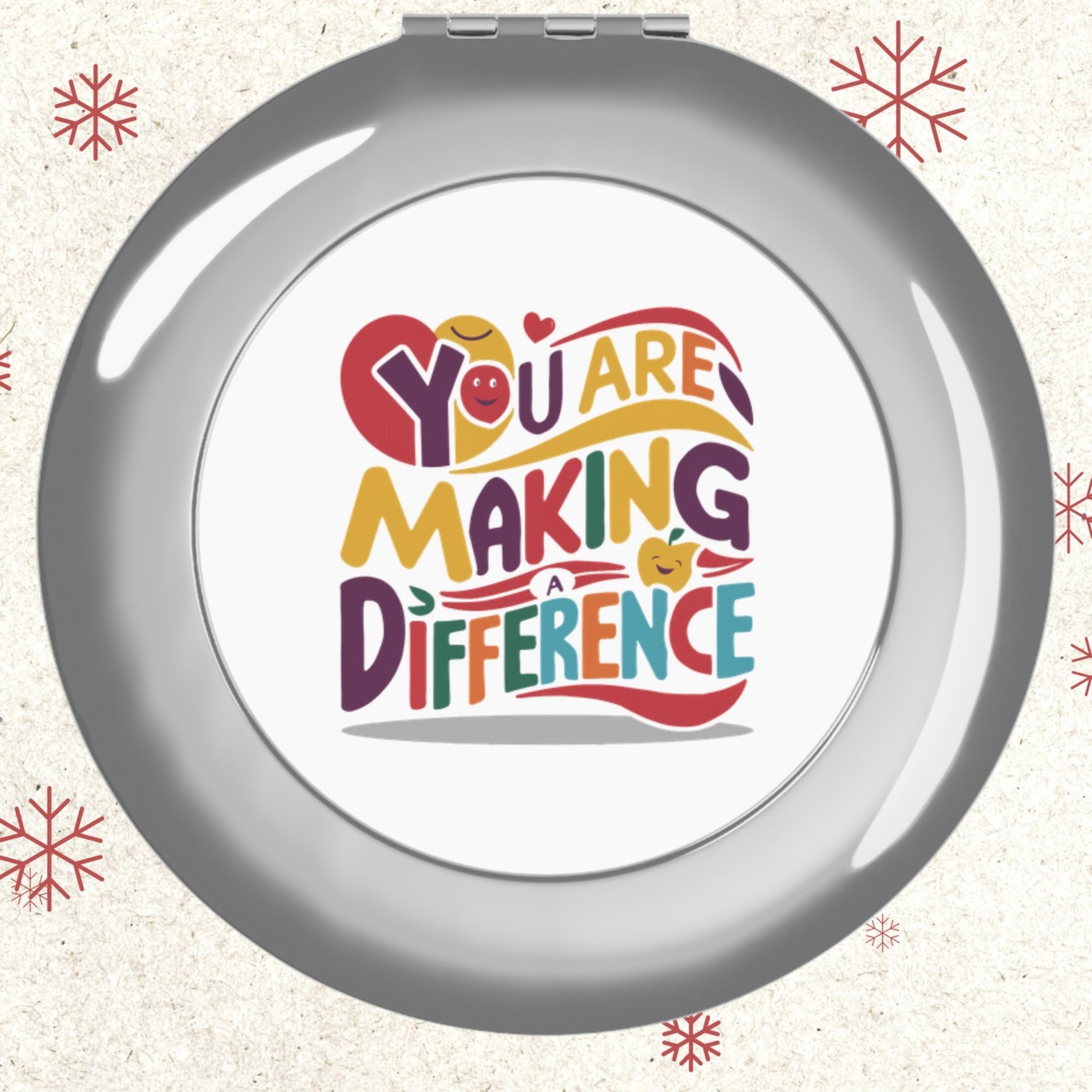 Celebrate the amazing women who make a difference with our "You Are Making a Difference" Compact Travel Mirror, a thoughtful Christmas gift for teachers, friends, or yourself. This personalized compact mirror is not just a stylish accessory but a practical tool for on-the-go touch-ups. Designed to be travel-friendly, it features a secure-snap friction closure, a sleek round shape, and a polished metal finish that adds a touch of elegance. Customizable with your own design on the white metal insert, this mirror is the perfect blend of functionality and personal touch, making it an ideal gift to show appreciation and keep your favorite people looking fabulous wherever they go. Do you know a woman who is making a difference in this world? This is a great way to show that you appreciate them.