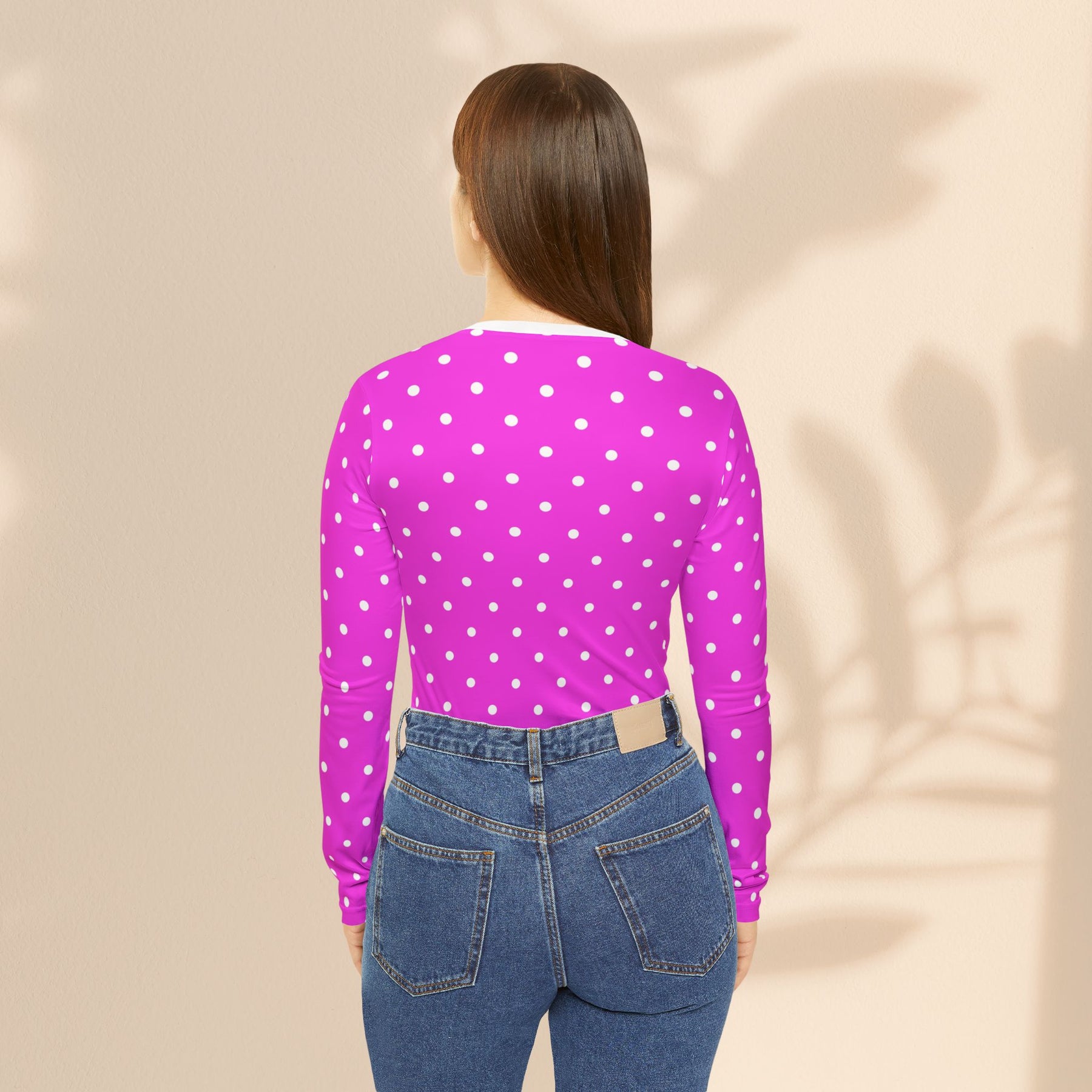 Add a playful pop of color to your wardrobe with this Polka Dot V-Neck Long Sleeve Shirt featuring a vibrant pink all-over print. The classic polka dot pattern brings timeless charm, while the flattering V-neckline and comfortable long sleeves create an easy, stylish fit. Designed with soft, breathable fabric, this cheerful top pairs effortlessly with jeans, skirts, or casual layers. Perfect for everyday wear, brunch outings, or relaxed weekends, this pink polka dot shirt combines fun retro style with modern comfort.